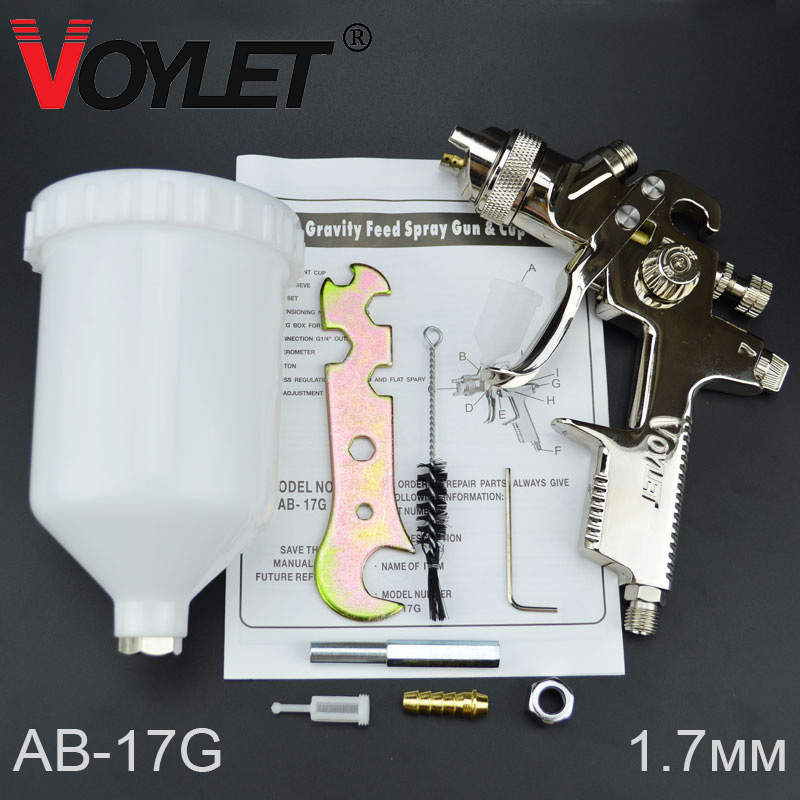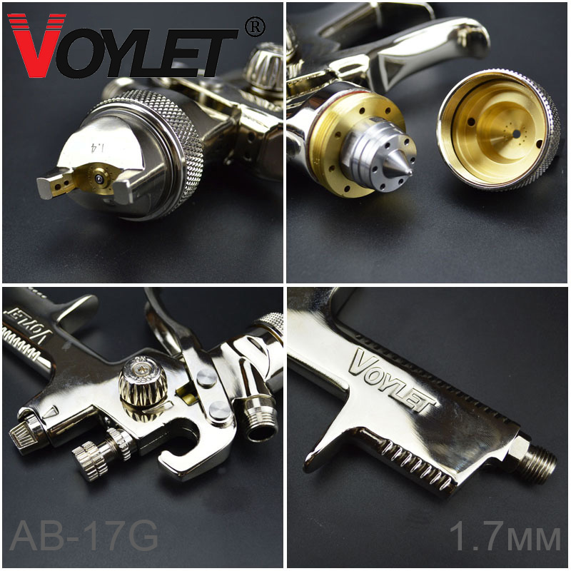 Краскораспылитель AB-17 с дюзой 1,7мм VOYLET - универсальный окрасочный пистолет системы HVLP (обеспечивает меньшее давление в воздушной головке и гарантирует более мягкую и легкую окраску, а также низкий уровень образования окрасочного тумана) с верхним бачком объемом 600мл. Применяется для нанесения различных лакокрасочных покрытий, таких как 1К базовые краски, покровные лаки, 2К акриловые краски, грунты – порозаполнители, антикоррозийные грунты и так далее. Распыляющая головка изготовлена из латуни (а не из алюминия), что обеспечивает её высокую износостойкость. Дюза, игла и корпус сделаны из нержавеющей стали. Регулировка подачи воздуха находится в верхней части ручки пистолета. Дюза 1,7 в основном используется для нанесения грунтовочных материалов.