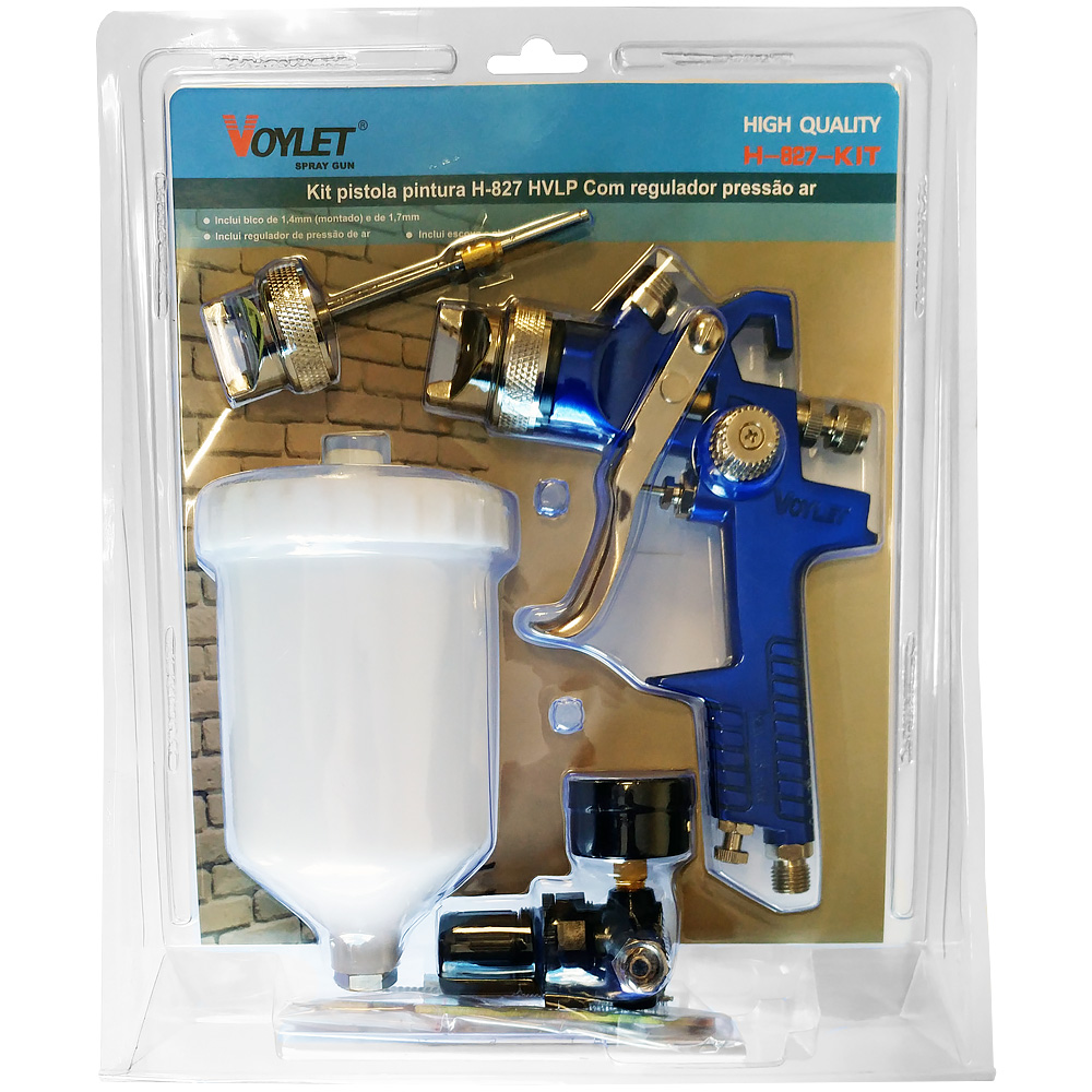 Краскораспылитель HVLP H-827 VOYLET в комплекте с двумя дюзами 1,4мм и 1,7мм VOYLET - универсальный окрасочный пистолет системы HVLP (обеспечивает меньшее давление в воздушной головке и гарантирует более мягкую и легкую окраску, а также низкий уровень образования окрасочного тумана) с верхним бачком объемом 600мл. Применяется для нанесения различных лакокрасочных покрытий, таких как 1К базовые краски, покровные лаки, 2К акриловые краски, грунты – порозаполнители, антикоррозийные грунты и так далее. Может применяться для нанесения красок на водной основе. Комплект дюз позволяет использовать краскопульт для различных ЛКМ.