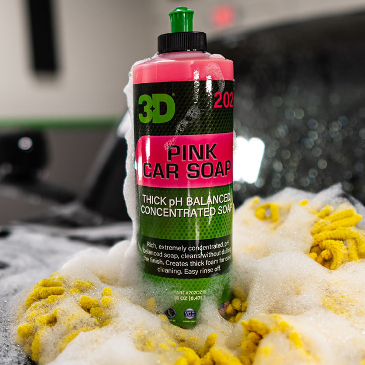 Концентрированный pH-сбалансированный шампунь Pink Car Soap 3D удаляет грязь, не повреждая восковое покрытие. Способствует образованию густой пены, которая легко справляется с грязью и дорожной пылью, при этом ЛКП автомобиля не тускнеет. Легко смывается и не оставляет следов. Может использоваться как для автоматической, так и ручной мойки. Безопасен для кожи. Безопасен для использования вместе с воском. Pink Car Soap обладает приятным ароматом и высокими очищающими способностями, а его рН-сбалансированная, биоразлагаемая формула, бережно очищает все окрашенные поверхности, резину, винил и пластмассовые детали экстерьера от въевшихся органических загрязнений, образующихся в результате эксплуатации автомобиля.