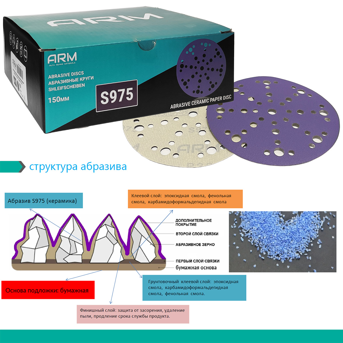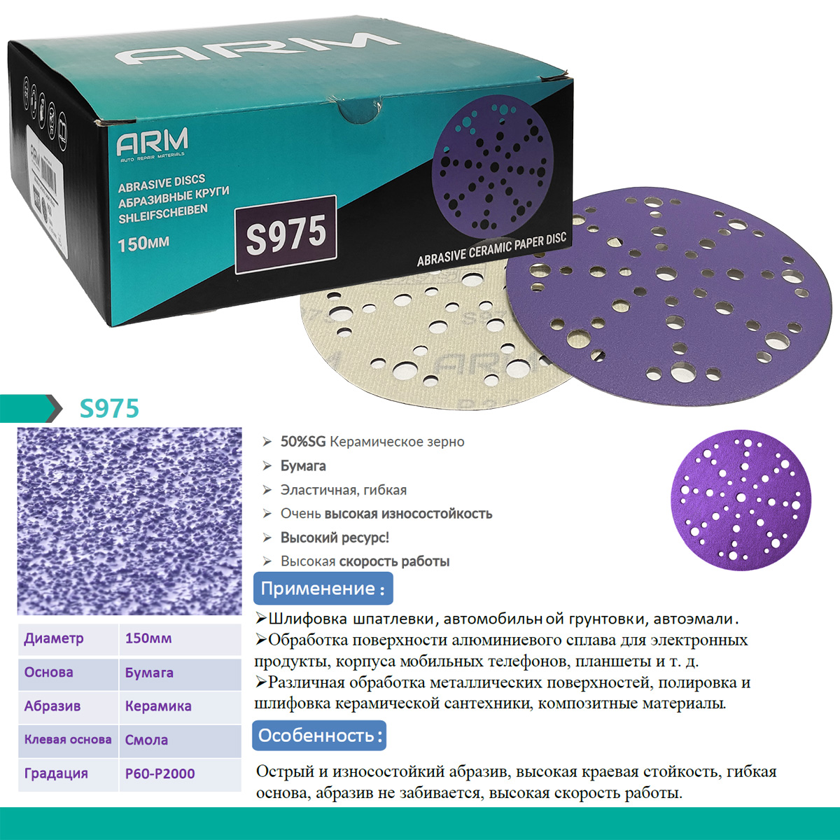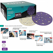 Шлифовальный абразивный круг S975 ARM на бумажной основе диаметром 150мм с премиальным керамическим зерном и множеством отверстий идеально подходят для удаления краски, грубой обработки кузовной шпатлевки, тонкой обработки краев и окончательной подготовки перед полировкой или грунтованием. Фиолетовые круги серии S975 от ARM обеспечивают быструю резку, результат быстрее других высококачественные абразивов, а также обладают великолепным сроком службы на всех этапах кузовного ремонта. Поверхность абразивного круга состоит из острых треугольных зерен, каждое из которых работает как отдельный режущий элемент для удаления лакокрасочных материалов. Конструкция абразивного круга S975 с множеством отверстий обеспечивает отличное удаление пыли, увеличивая скорость резки и ресурс круга. При производстве керамических шлифовальных кругов используется бумажная подложка и мощный клеевой состав.