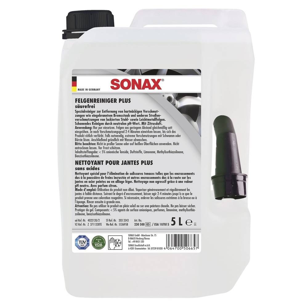 Специальный очиститель колесных дисков SONAX (арт. 230 500) предназначен для удаления таких устойчивых загрязнений, как въевшаяся тормозная пыль, остатки масла и другие уличные загрязнения лакированных дисков из стали и легких металлов. Бережное очищение нейтральным pH-показателем. Предназначен для использования в качестве очистителя дисков в и вне моечных установок. Не содержит кислоты.