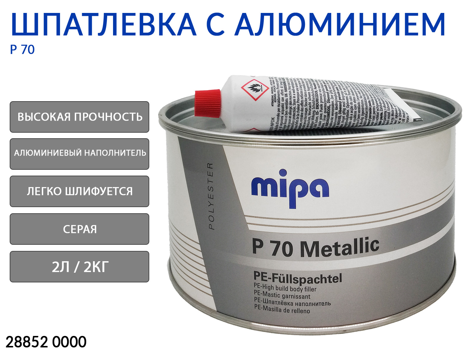 Шпатлевка c алюминиевым наполнителем P70 Mipa (288520000) - это высококачественная, безасбестовая, алюминиевая пигментированная 2K кузовная шпатлевка на основе полиэфирной смолы, специально разработанная так, чтобы отвечать требованиям высокого качества в автомобильной промышленности и отрасли повторной отделки с точки зрения обработки, адгезии и возможности шлифовки. Данное изделие подходит для ровных вмятин и неровностей на железе, стали или даже армированном стеклопластике (GRP). Нанесение на вертикальные поверхности не вызывает каких-либо проблем. Изделие хорошо шлифуется, обладает большой вертикальной стабильностью и адаптивностью.