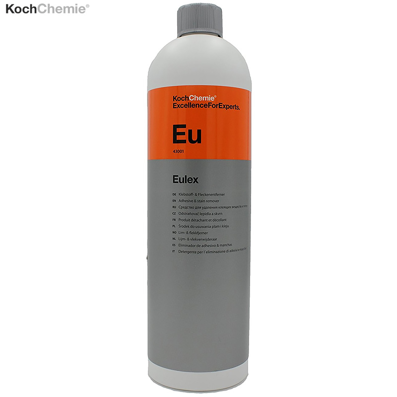 Профессиональный очиститель Eulex KOCH CHEMIE (43001) предназначен для быстрого избавления от пятен краски и остатков клея, особенно после удаления пятен от наклеек на автомобилях. Легко удаляет остатки клея со стекла после растонирования. Отлично удаляет с ЛКП чужеродную краску от рисунков «граффити» и свежую краску от дорожной разметки. Очищает ЛКП от приставшей резины, древесной и дорожной смолы. Внутри салона применяется для удаления
