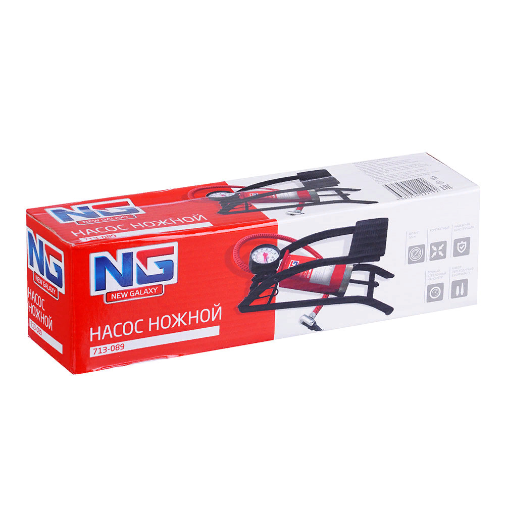 Механический одноцилиндровый ножной насос 713-089 NEW GALAXY предназначен для накачивания шин легковых автомобилей, велосипедов, мячей, матрасов и других надувных изделий. В комплекте набор переходников.