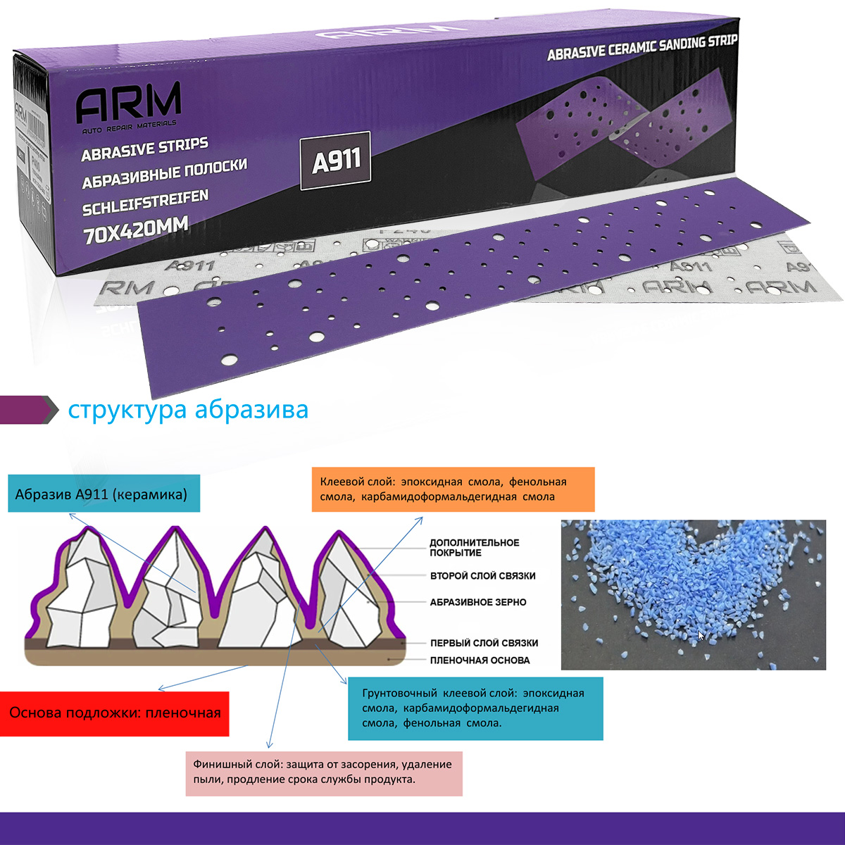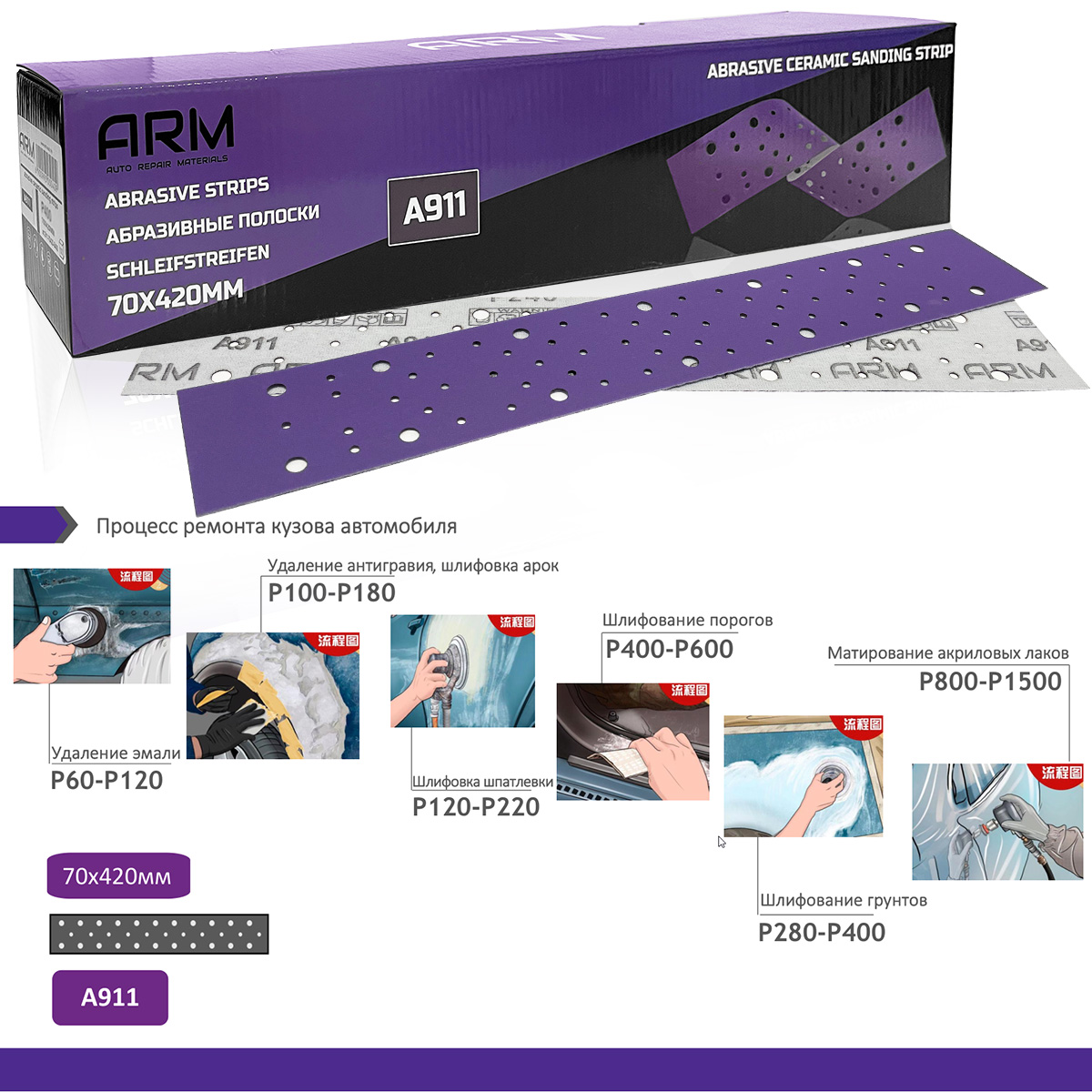 Абразивная полоска A911 ARM размером 70х420мм с керамическим зерном и множеством отверстий (69) идеально подходят для удаления краски, грубой обработки кузовной шпатлевки, тонкой обработки краев и окончательной подготовки перед полировкой или грунтованием. Фиолетовые полоски серии А911 от ARM обеспечивают превосходную резку, результат быстрее других высококачественные абразивов, а также обладают отличным сроком службы на основных этапах кузовного ремонта. Поверхность абразивной полоски состоит из острых треугольных зерен, каждое из которых работает как отдельный режущий элемент для удаления лакокрасочных материалов. Конструкция абразивной полоски A911 с множеством отверстий обеспечивает отличное удаление пыли, увеличивая скорость резки и срок службы полоски. При производстве керамических шлифовальных полосок используется плёночная подложка и мощный клеевой состав.