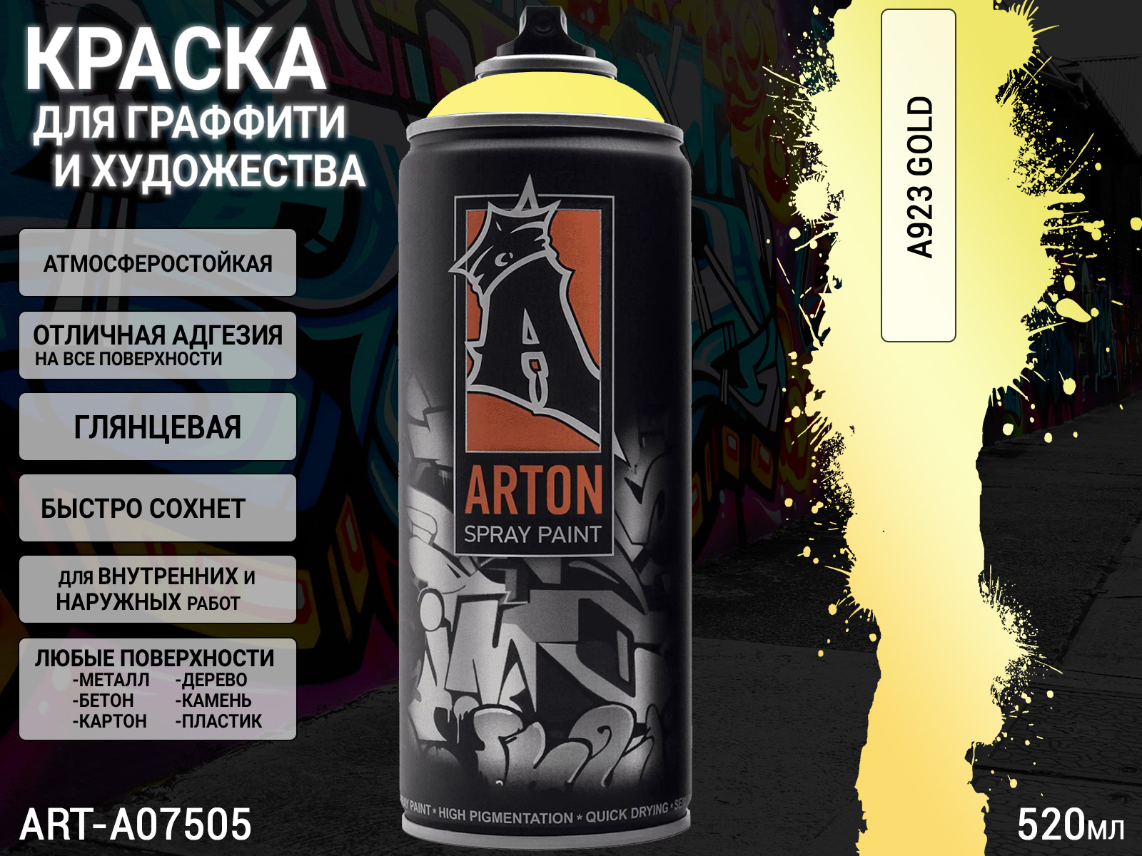 1. A923 золото/GOLD краска для граффити аэрозоль ARTON (520мл)1