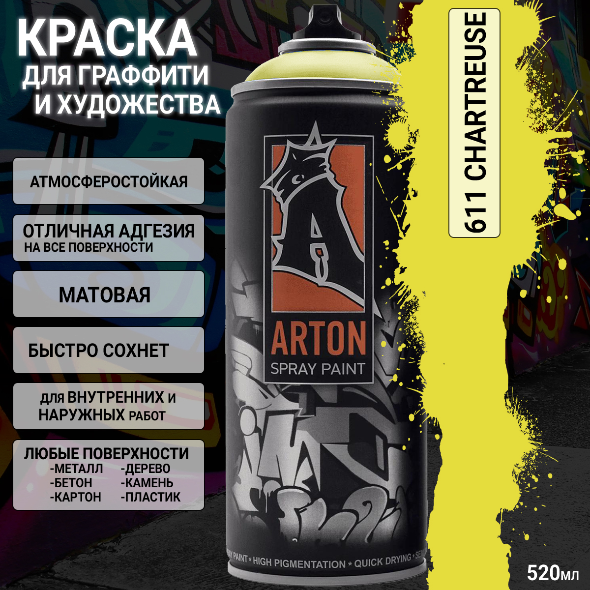 1. A611 Chartreuse краска для граффити аэрозоль ARTON (520мл)1