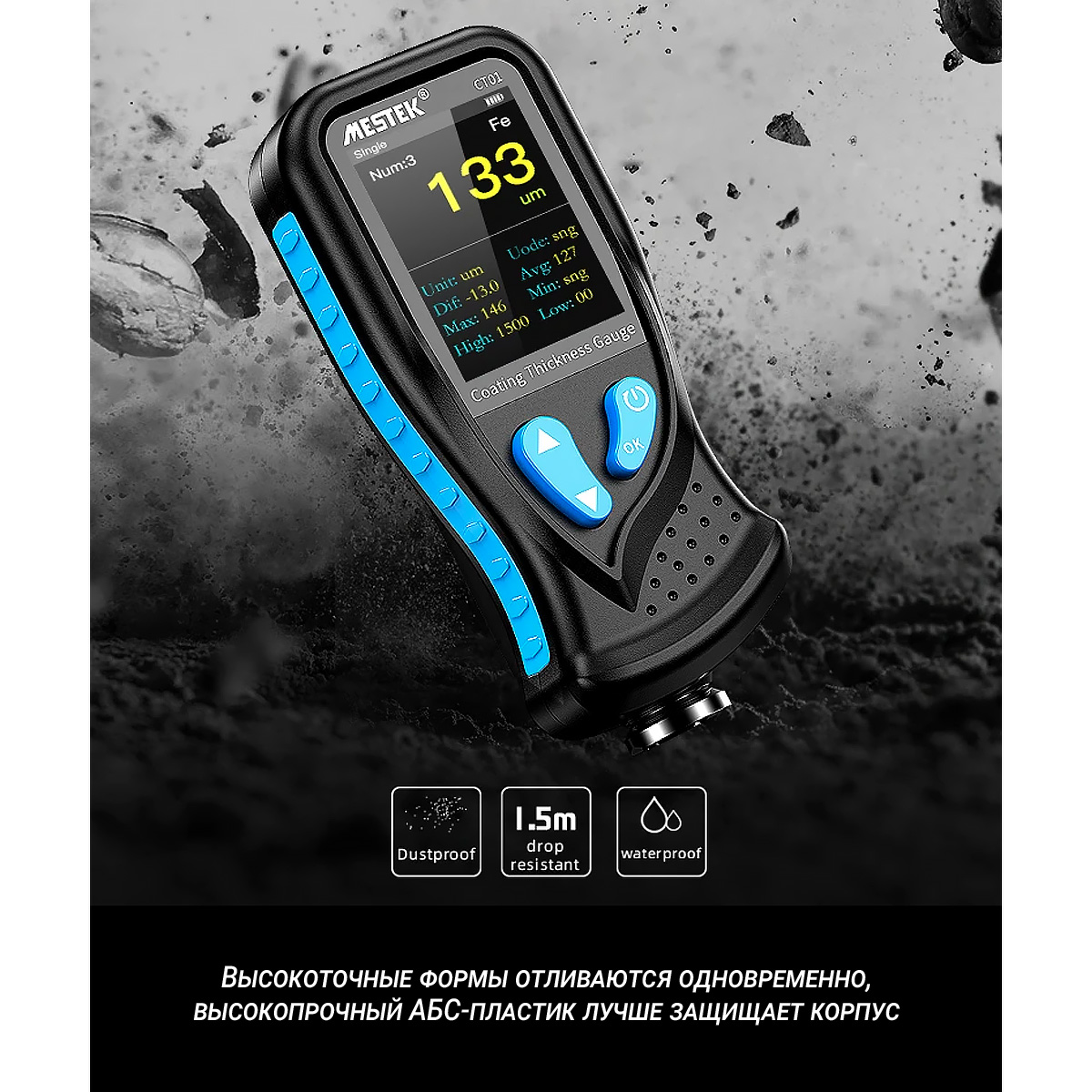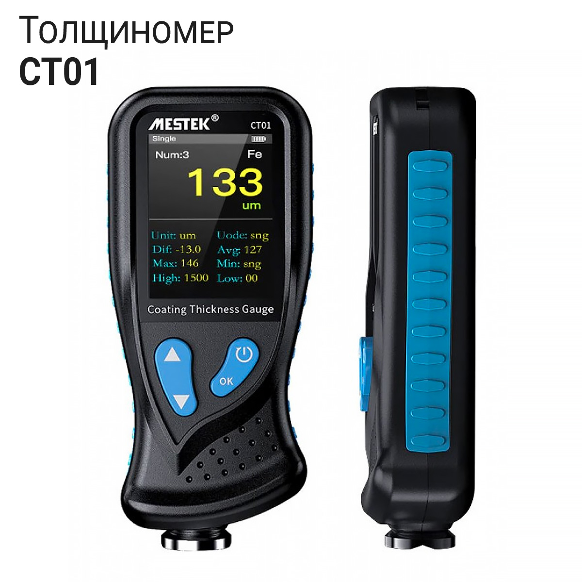 Профессиональный толщиномер СТ01 MESTEK - профессиональная модель для измерения толщины лакокрасочного покрытия металлических и неметаллический оснований. Толщиномер СТ01 обеспечивает быстрое и точное измерение толщины лакокрасочного покрытия в диапазоне от 0 до 1300 мкм. Толщиномер краски Mestek CT01 автоматически определяет тип металла Fe/NFe и выполняет измерение толщины в диапазоне до 1300 мкм, с разрешением 0,1мкм (до 100мкм) и 1мкм (более 100мкм). Основным отличием толщиномера краски Mestek CT01 является цветной дисплей с функцией автоповорота экрана (вертикальное/горизонтальное), а так же питание от литий-ионного аккумулятора Li-ion 3.7V 1000 mAh (зарядка аккумулятора осуществляется через USB-разъем) что более эффективно при частом профессиональном применении. Память толщиномера позволяет сохранять 30 результатов измерений и обеспечивает одновременную индикацию на дисплее так же значений MAX / MIN / DIFF / AVG.