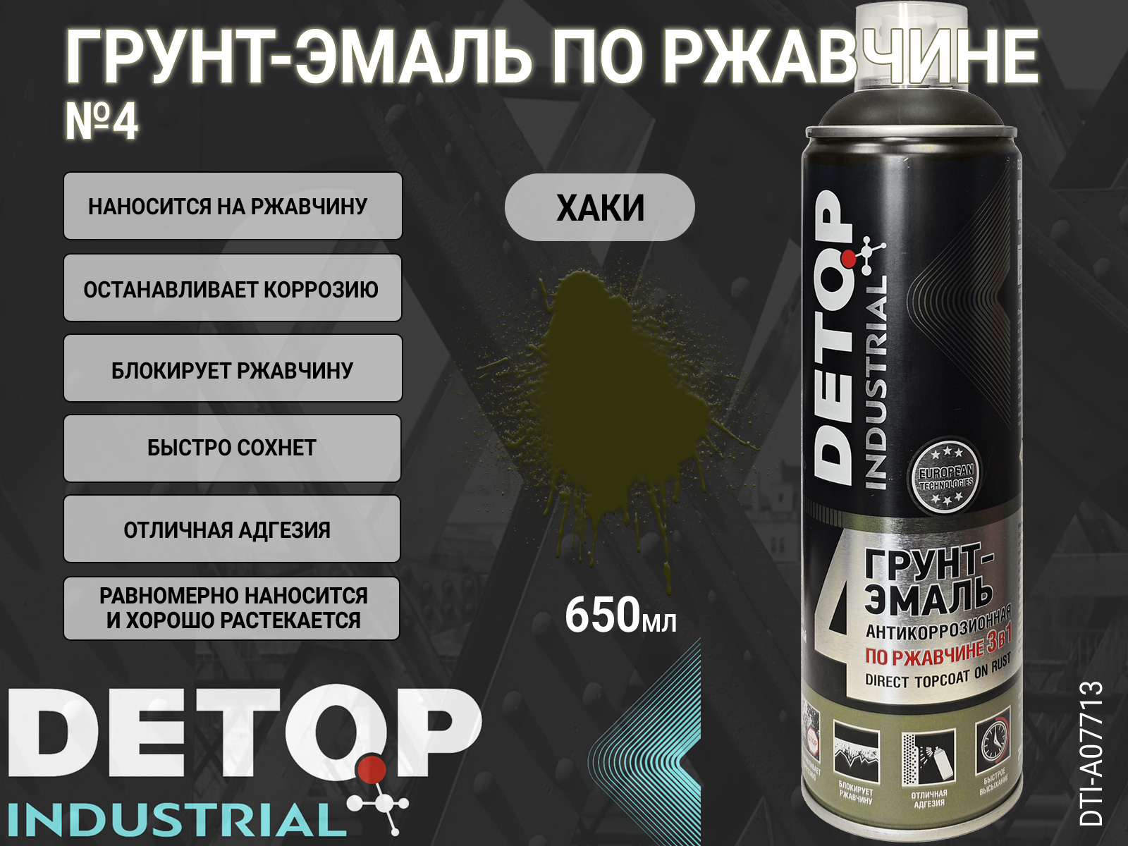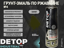 1. грунт-эмаль №4 по ржавчине хаки (защитная) "3 в 1" INDUSTRIAL DETOP (аэрозоль, 650мл)1
