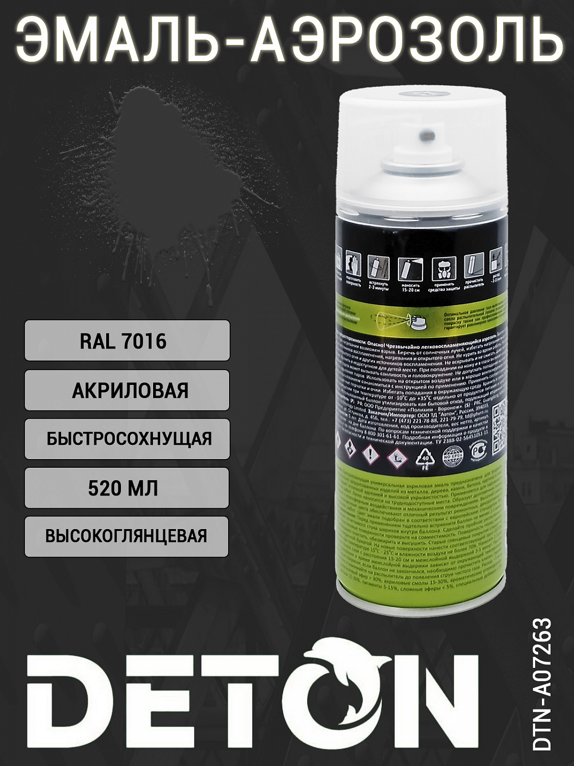 1. эмаль-аэрозоль акриловая RAL 7016 антрацитово-серый быстросохнущая DETON UNIVERSAL (520мл) 1