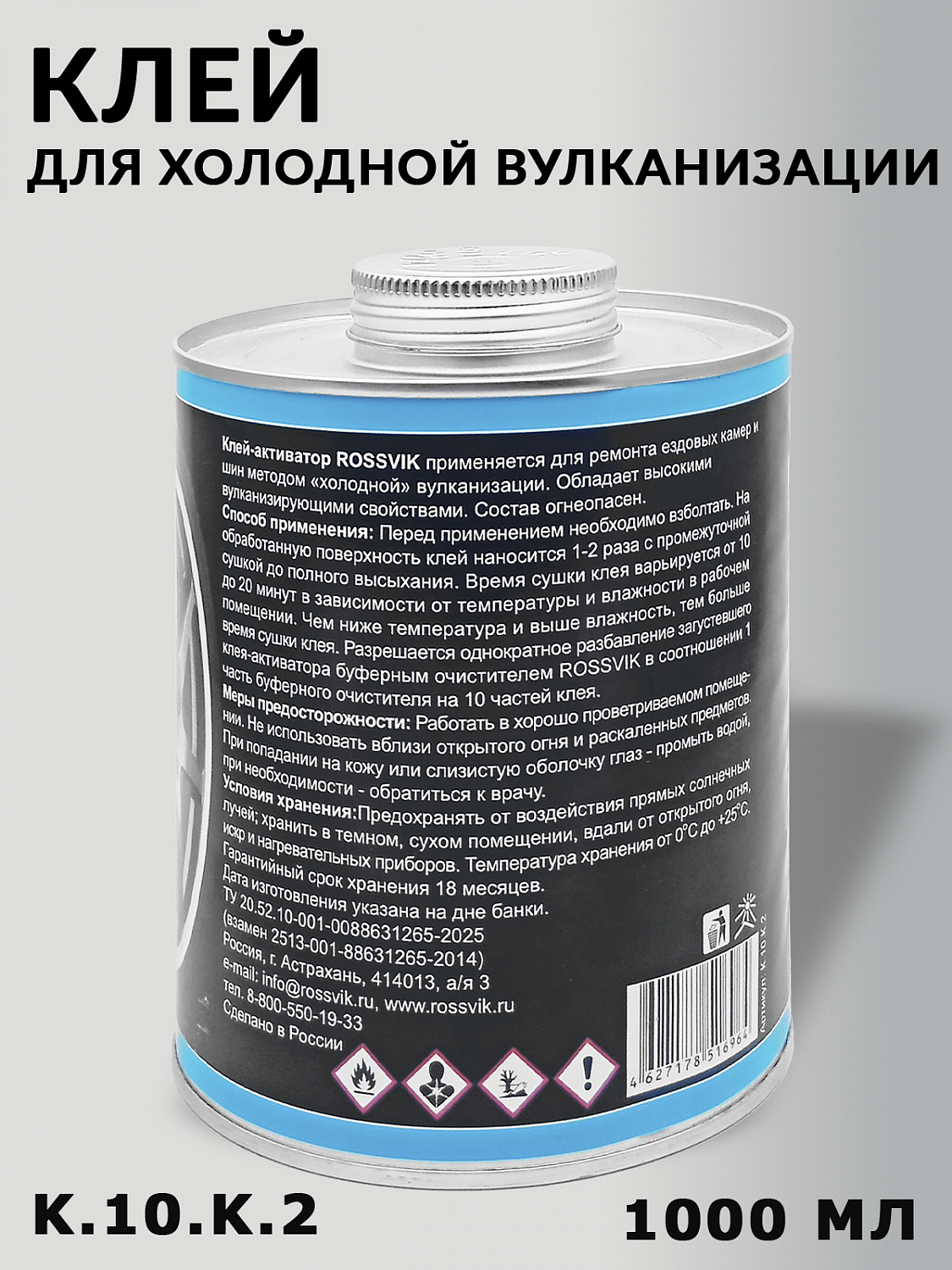Клей для ХОЛОДНОЙ вулканизации ROSSVIK (K.10.K.2) – это универсальный клей-активатор, который эффективно применяется для восстановления повреждений с использованием латок, грибков, жгутов и кордовых пластырей методом "холодной" вулканизации.