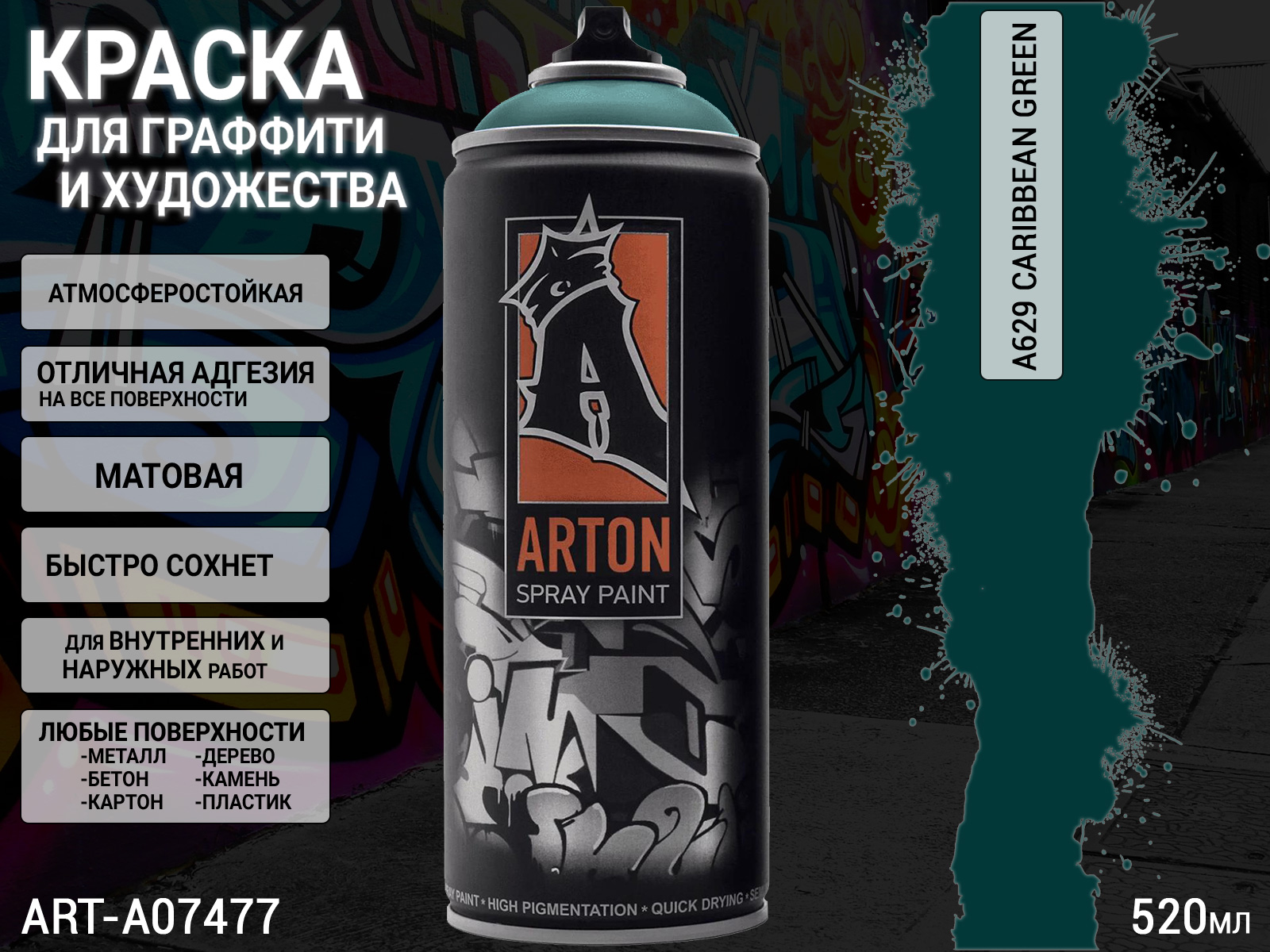 1. A629 карибский зеленый/CARIBBEAN GREEN краска для граффити аэрозоль ARTON (520мл)1