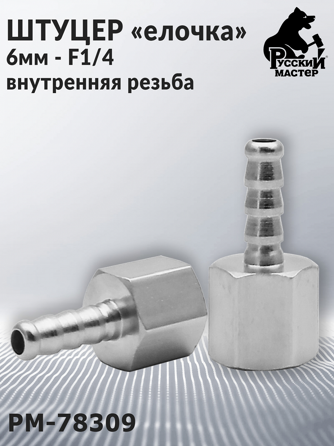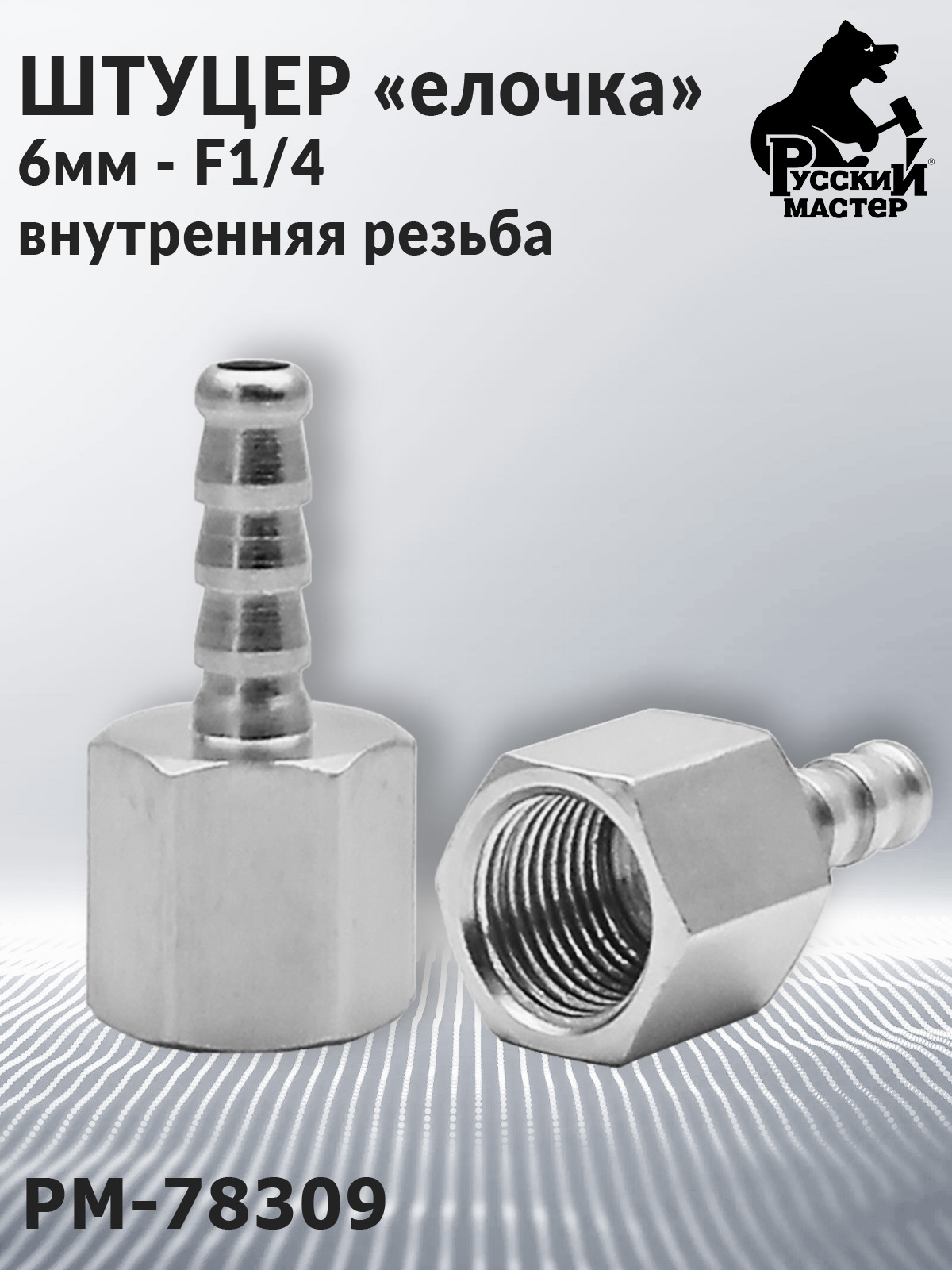 Штуцер под ёлочку 6 мм с внутренней резьбой 1/4" (F1/4) РУССКИЙ МАСТЕР (PM-78309 ) предназначен для надёжного и герметичного подсоединения гибких шлангов к компонентам с резьбовым входом. Универсальный элемент подходит для широкого спектра задач: от пневматики и водопроводных линий до бытовых и промышленных систем.