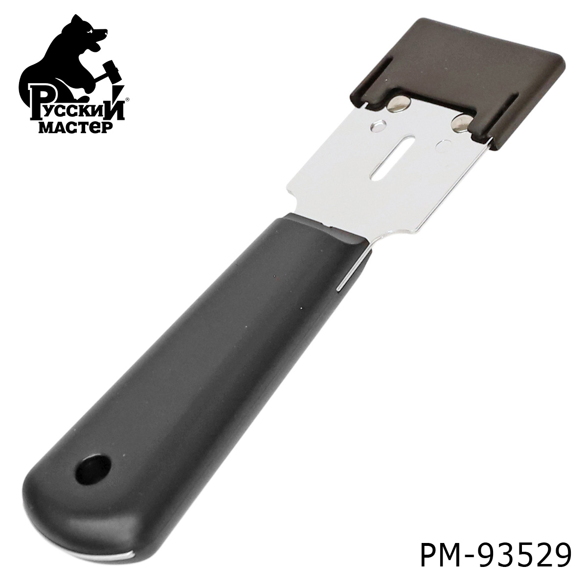 Скребок с лезвием Русский Мастер (РМ-93529) для удаления остатков герметика и клея с ветрового стекла. Скребок имеет металлический держатель, в котором закреплено лезвие, сделанное в виде пластины.