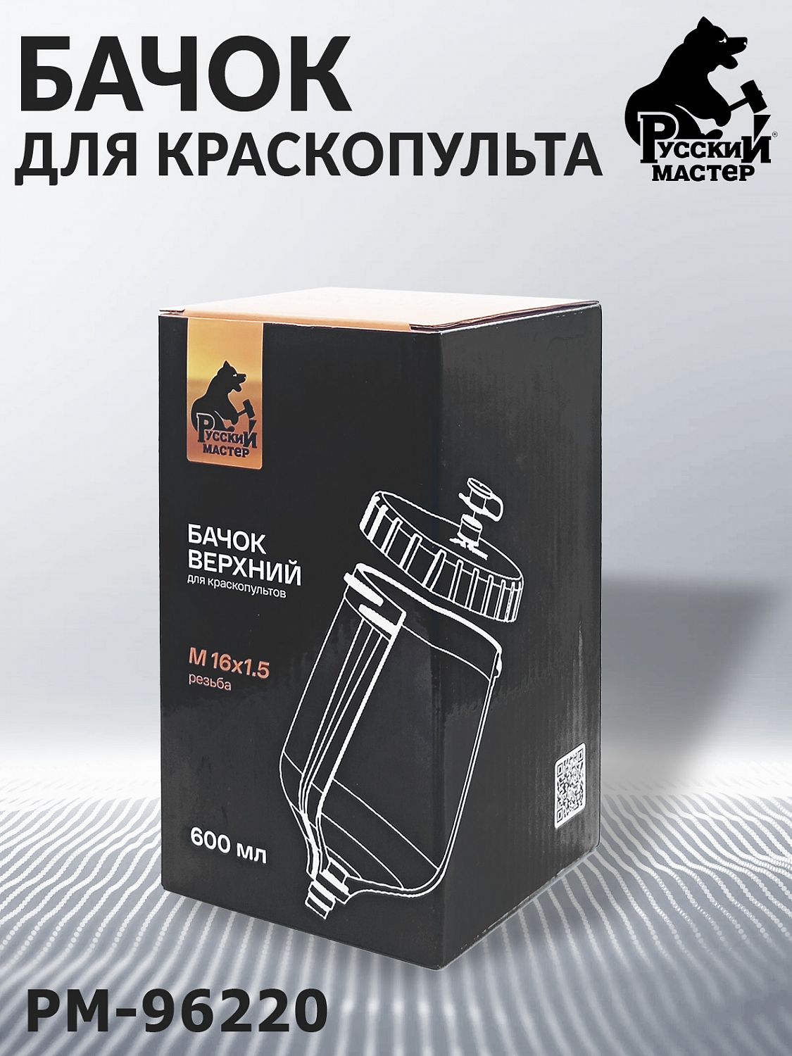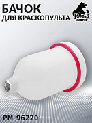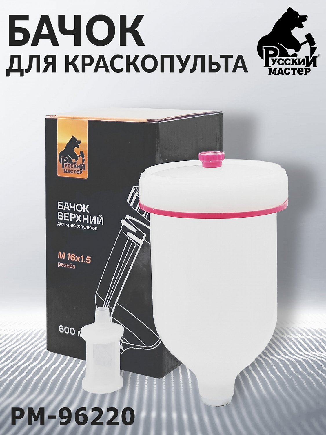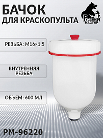 Верхний пластиковый бачок (PM-96220) РУССКИЙ МАСТЕР, предназначенный для краскопультов и аэрографов с внутренней резьбой М16×1.5. Обеспечивает надёжную подачу красящего материала, удобство обслуживания и совместимость со стандартными профессиональными инструментами.