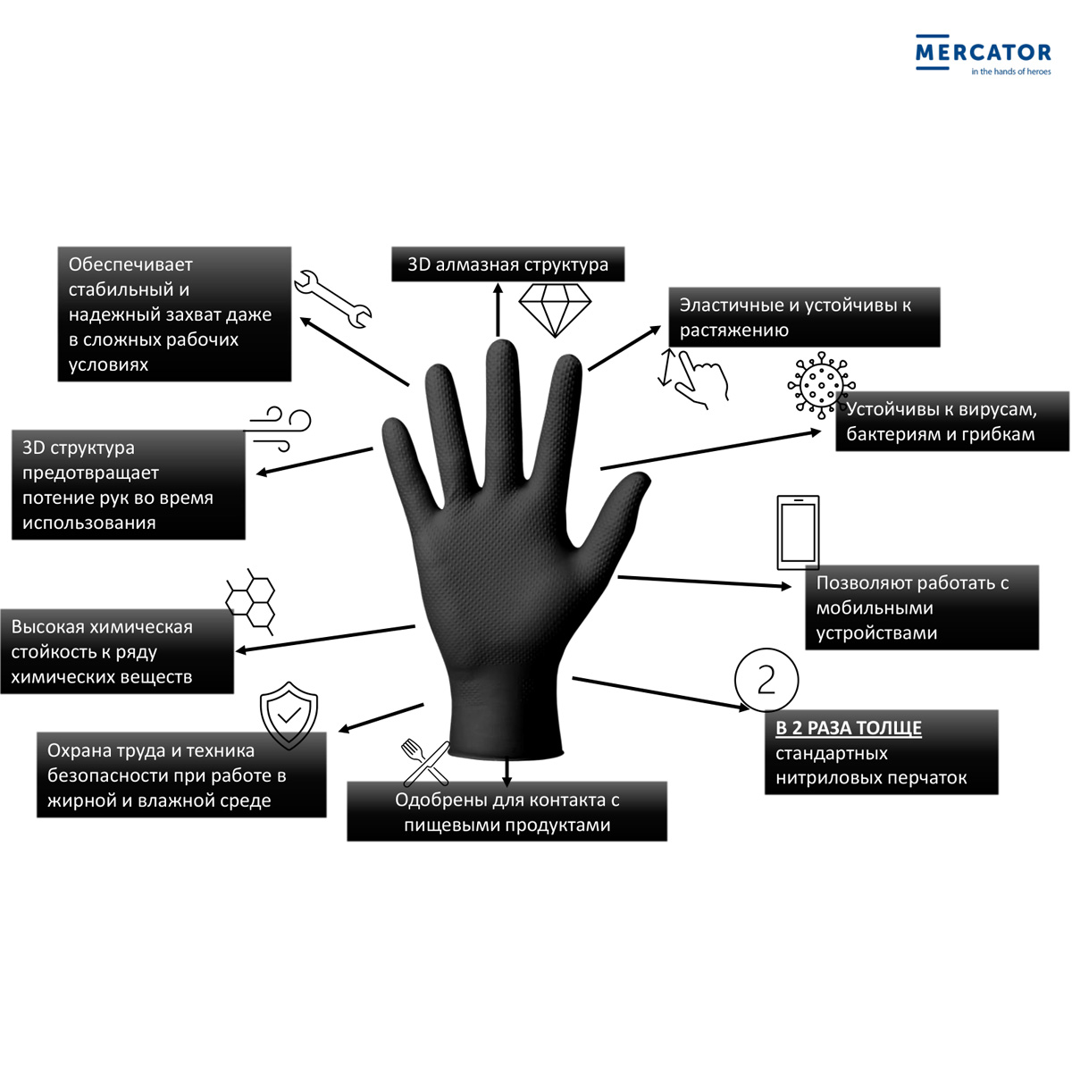 Специализированные защитные нитриловые перчатки GOGRIP от MERCATOR с толстыми стенками и алмазной структурой, обеспечивающие отличное сцепление и защиту при работе в масляной или влажной среде. Защитные, нестерильные перчатки имеют универсальную форму, подходит для правой и левой руки. Перчатки Gogrip черного цвета в 2 раза толще обычных нитриловых перчаток, при этом имеют высокую эластичность и стойкость к растяжению. Революционная трехмерная 3D алмазная структура поверхности: обеспечивает стабильный и надёжный захват даже в сложных средах, а также предотвращает потливость ладони во время использования.