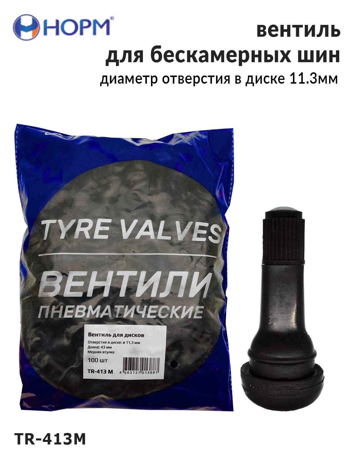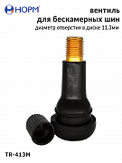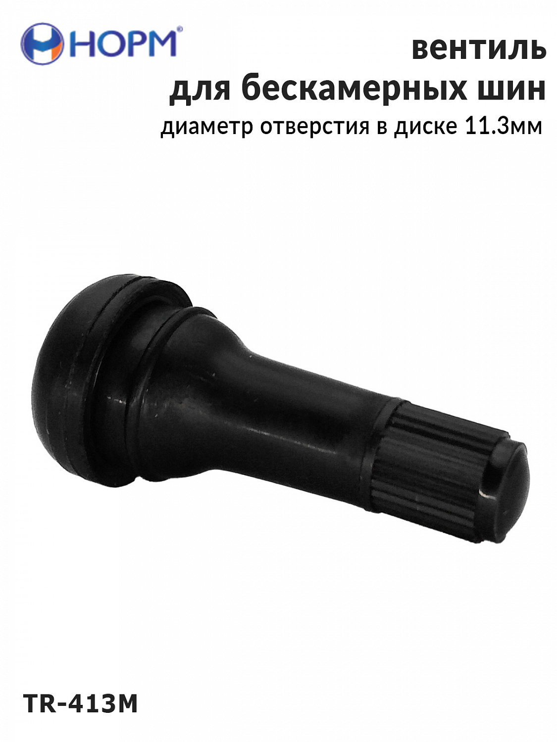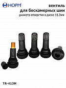Резиновый универсальный вентиль НОРМ (TR413М) устанавливается на любые бескамерные колеса легковых автомобилей, грузовых автомобилей малой грузоподъемности, прицепы и полуприцепы, спецтехнику с диаметром отверстия в диске 11,3мм специальным инструментом. Подходит для большинства литых и штампованных дисков.