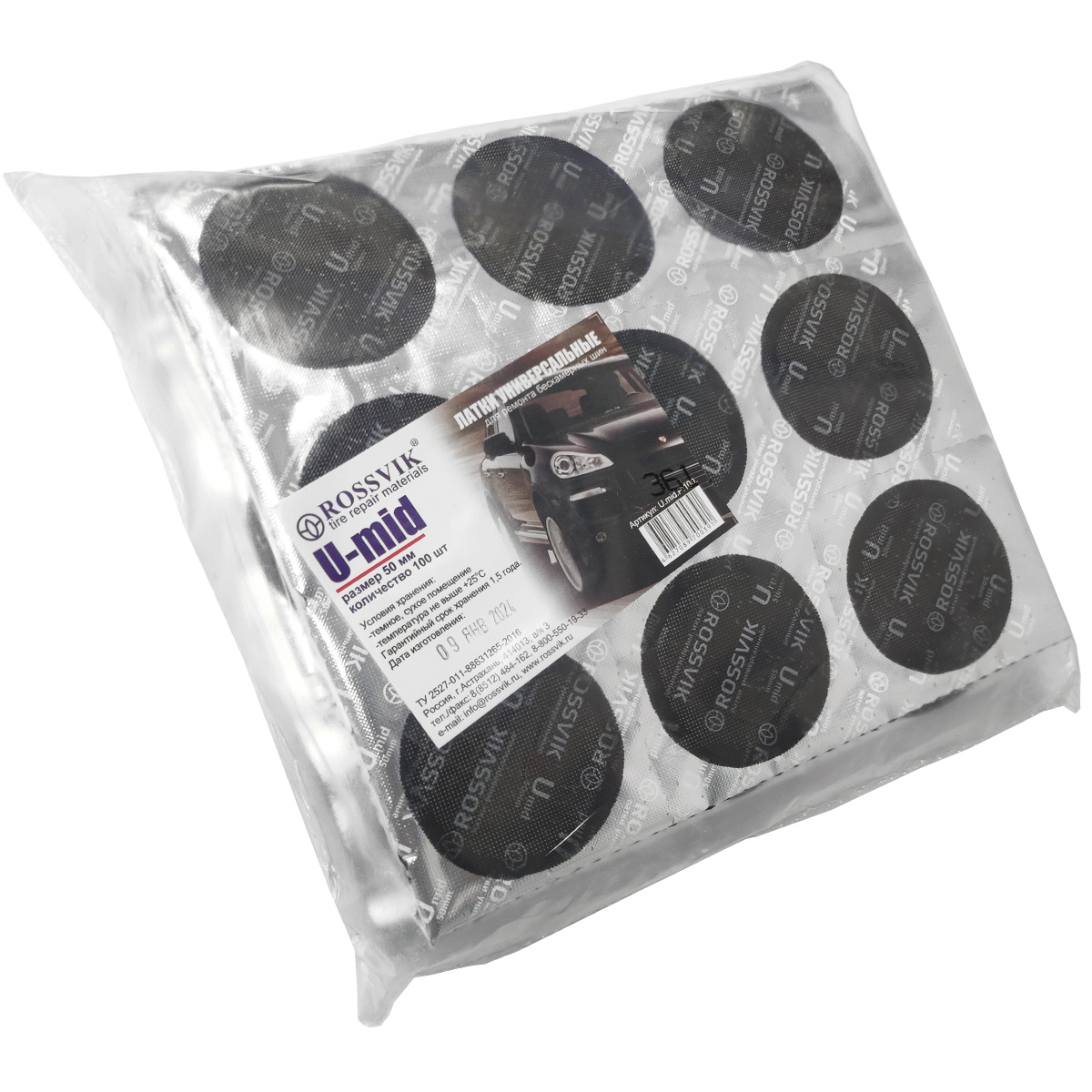 Универсальные круглые заплатки Rossvik (U-mid) применяются для ремонта любых шин радиального и диагонального типа. С омощью этиъ латок можно отремонтировать повреждение в любом месте протектора или боковой порез на покрышке легкового автомобиля, сельскохозяйственной техники, грузового пассажирского транспорта.