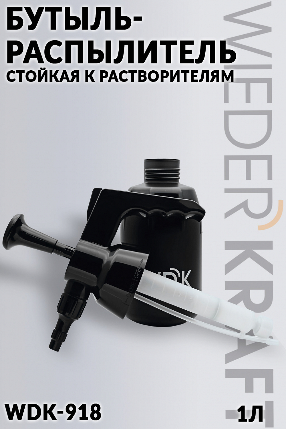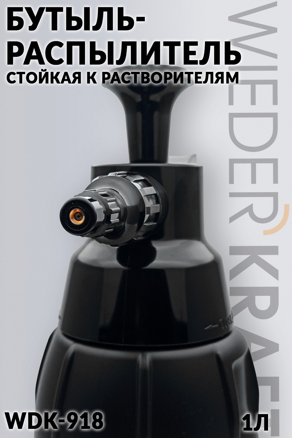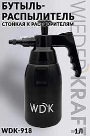 Ручная бутыль WIEDERKRAFT (WDK-918) с распылителем и нагнетателем давления стойкая к химическим составам на основе сольвента. В отличие от большинства аналогов, попадающих на российский рынок из Азии, распылитель WDK-918 изготовлен из высококачественной, химически стойкой пластмассы. Сопло выполнено из латуни. Все детали механизма подогнаны очень точно и сидят без люфтов. Распылитель WDK-918 легко накачивается и отлично держит давление. Оснащен удобной и простой регулировкой факела распыла. Объем бачка распылителя 1 литр.