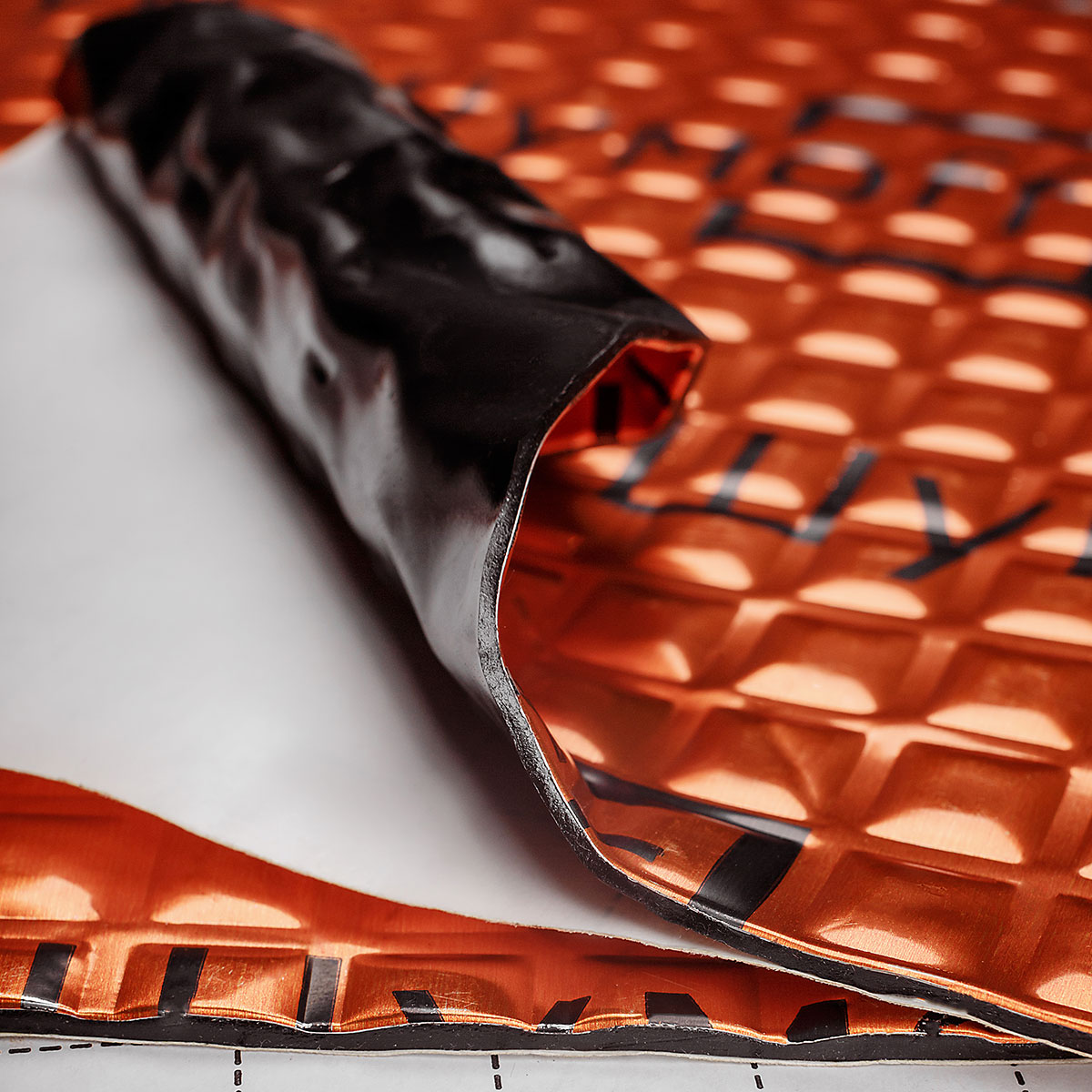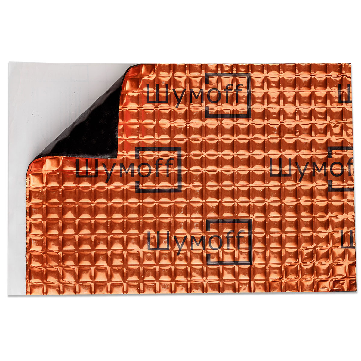 Мастичный слой защищен антиадгезионной бумагой, на которой присутствует логотип Шумоff и разметка, что обеспечивает защиту от подделок и упрощает раскрой материала.